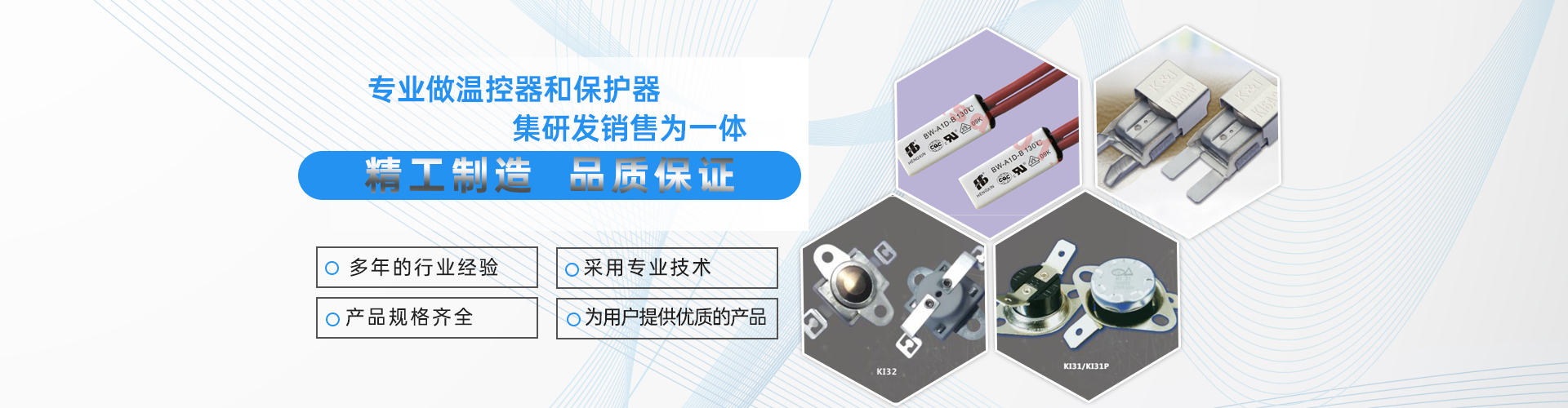 我司主打6大系列溫控器以及保護(hù)器(KI31.KSD301. KI32 . KI71/KI71P.17AM . KI6A/KI6AP . KI72/KI72P . BW.KW),上百種規(guī)格溫敏控制器;產(chǎn)品全部符合歐盟ROHS環(huán)保要求,所有產(chǎn)品均申請(qǐng)VDE、TUV、UL、CUL、CQC、CB各項(xiàng)安規(guī)認(rèn)證。